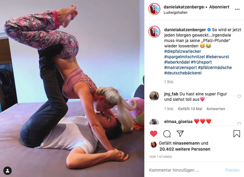 Auf Instagram postete Daniela Katzenberger ein neues lustiges Bild, auf dem zusehen ist, wie Lucas Cordalis seine Freundin knutscht, während sie eine Hebefigur nachstellen. Dazu schrieb sie: „So wird er jeden Morgen geweckt. Irgendwie muss man ja seine ‚Pfalz-Pfunde‘ wieder loswerden“ und packte dazu noch ein paar witzige Hashtags wie zum Beispiel #matratzensport. Ganz schön gelenkig und sportlich die beiden! Halt! Moment mal?! Wir von Schlager.de haben da so eine Vermutung: Könnte es vielleicht sein, dass der Sänger auf diese Art und Weise mit seiner Katze für die RTL-Sendung „Let’s Dance“ 2021 trainiert? (Schöne Überraschung: Florian Silbereisen kommt zum ZDF!)