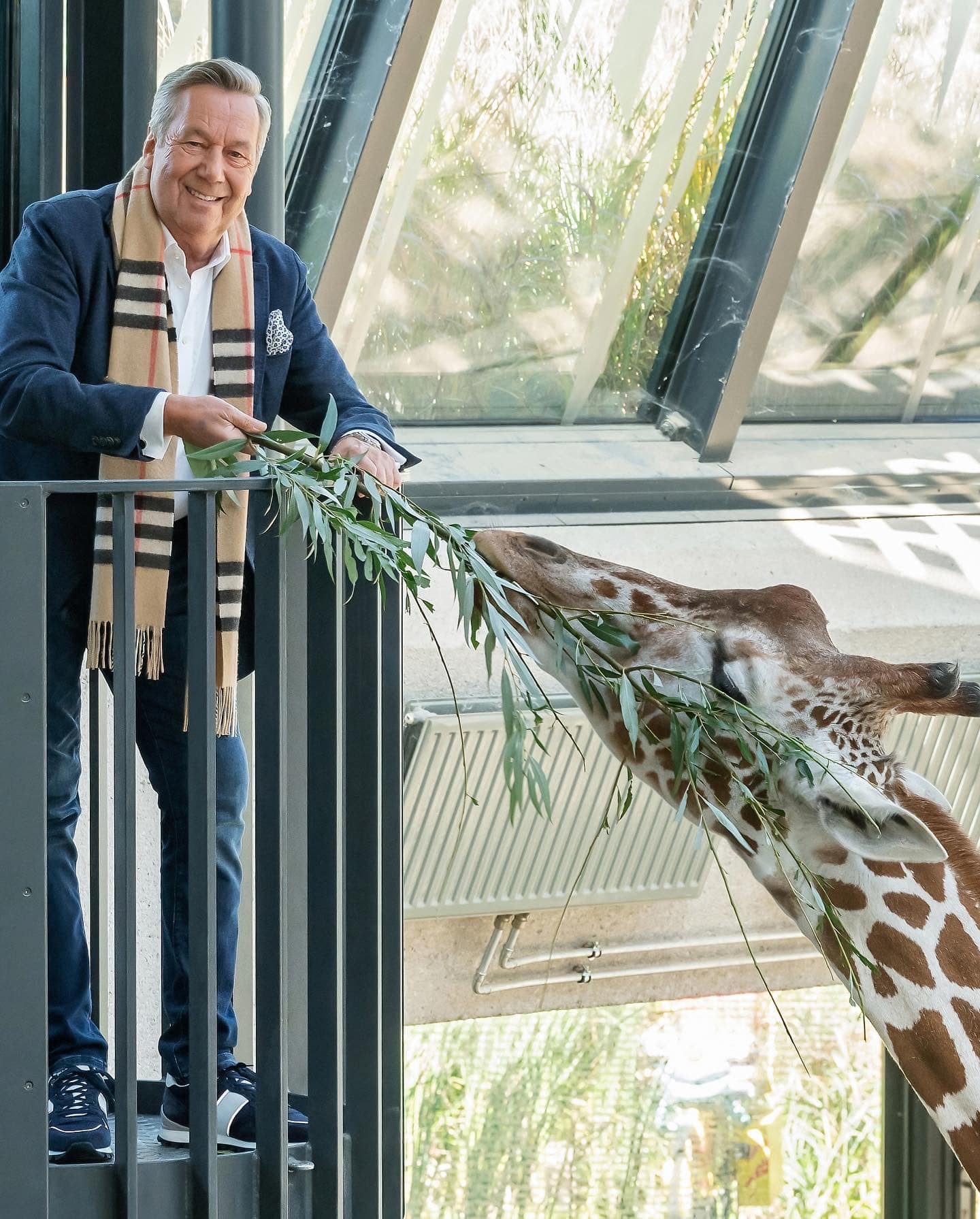 Auf der Aussichtsplattform im Giraffenhaus kam Roland Kaiser, der kürzlich eine Management-Firma mit Tochter Annalena gründete, den Giraffen dann ganz nah. Nicht nur die Schlagerfans scheinen den Star zu lieben. Denn auch die Giraffe, die er dort fütterte, bekam gar nicht genug: Gierig zerrt sie an dem großen Halm, den der 70-Jährige in den Händen hält. Wenn man vom Großmeister des Schlagers Essen serviert bekommt, scheint es gleich noch besser zu schmecken.
