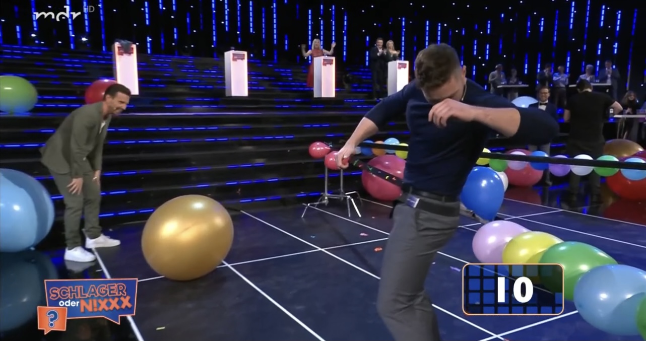 Der absolute Höhepunkt war das Popo-Pieks-Spiel von Ramon Roselly. Dem „DSDS“-Gewinner wurde an seinem Allerwertesten ein „Bienenstachel“ angebunden, mit dem er Luftballons zerstechen musste.